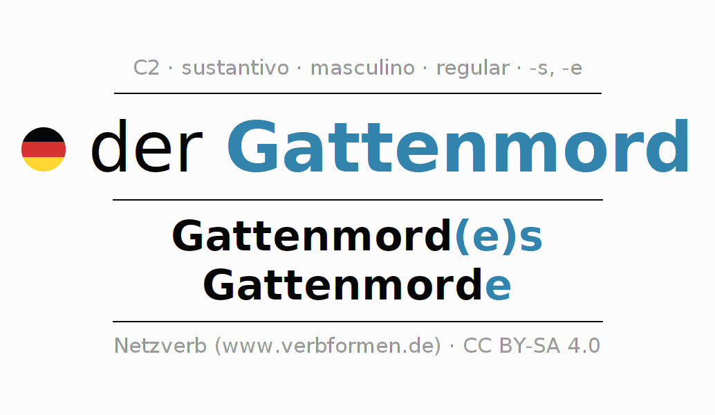 La declinación del sustantivo en forma de tabla con todas su formas: singular, plural y en los cuatro casos: nominativo (primer caso), genitivo (segundo caso), dativo (tercer caso) y acusativo (cuarto caso). Las construcciones gramaticales están representadas de forma clara en una tabla sinópica. La inflexión de los sustantivos es una ayuda durante tareas, exámenes, para cursos de alemán, la universidad, el estudio del alemán como lengua extranjera o como segundo idioma y para estudiantes adultos. La declinación correcta de las palabras es especialmente importante para los que aprenden el idioma alemán. Aquí encontraras más información acerca del tema Wiktionary Gattenmord y aquí también a través del Duden Gattenmord.