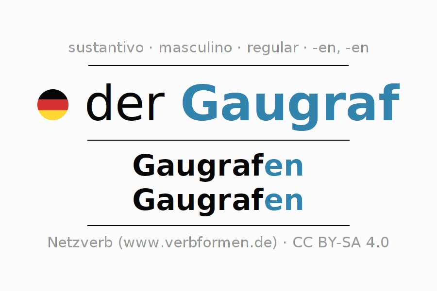 La declinación del sustantivo en forma de tabla con todas su formas: singular, plural y en los cuatro casos: nominativo (primer caso), genitivo (segundo caso), dativo (tercer caso) y acusativo (cuarto caso). Las construcciones gramaticales están representadas de forma clara en una tabla sinópica. La inflexión de los sustantivos es una ayuda durante tareas, exámenes, para cursos de alemán, la universidad, el estudio del alemán como lengua extranjera o como segundo idioma y para estudiantes adultos. La declinación correcta de las palabras es especialmente importante para los que aprenden el idioma alemán. Aquí encontraras más información acerca del tema Wiktionary Gaugraf y aquí también a través del Duden Gaugraf.