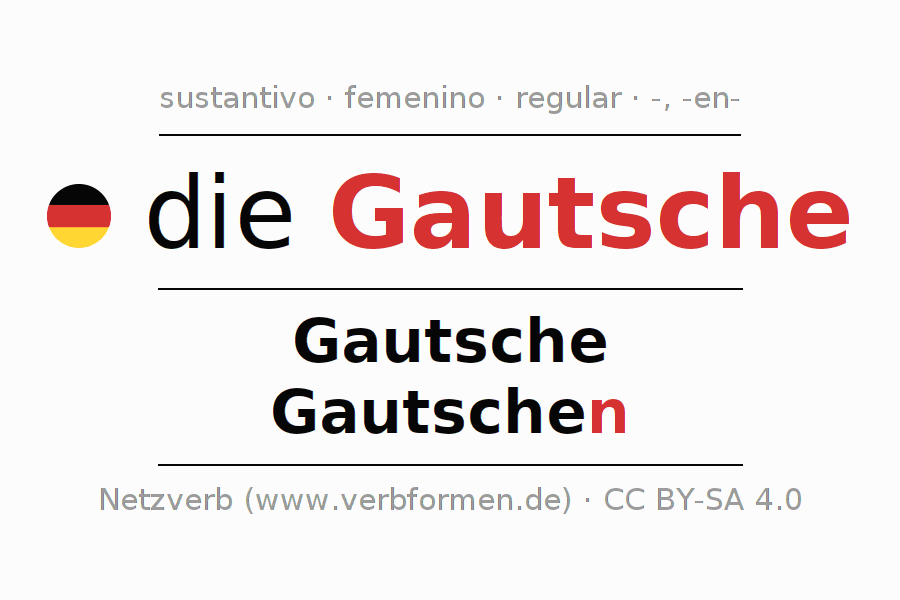 La declinación del sustantivo en forma de tabla con todas su formas: singular, plural y en los cuatro casos: nominativo (primer caso), genitivo (segundo caso), dativo (tercer caso) y acusativo (cuarto caso). Las construcciones gramaticales están representadas de forma clara en una tabla sinópica. La inflexión de los sustantivos es una ayuda durante tareas, exámenes, para cursos de alemán, la universidad, el estudio del alemán como lengua extranjera o como segundo idioma y para estudiantes adultos. La declinación correcta de las palabras es especialmente importante para los que aprenden el idioma alemán. Aquí encontraras más información acerca del tema Wiktionary Gautsche y aquí también a través del Duden Gautsche.