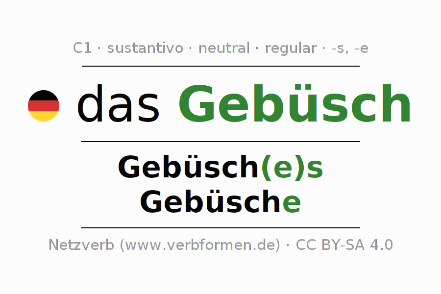La declinación del sustantivoGebüsch (matorral, arbusto) se encuentra en genitivoGebüsch(e)s del singular y en el nominativoGebüsche del plural. El sustantivo Gebüsch se conjuga de forma fuerte (irregular) con estas terminaciones es/e. El género gramatical de Gebüsch es neutro y por eso se requiere el artículo definido ‘das’. Aquí puedes declinar no solamente Gebüsch sino también todos los sustantivos alemanes . Este sustantivo pertenece al vocabulario necesario para pasar el examen "Zertifikat Deutsch" o para el nivel C1. Comentarios ☆