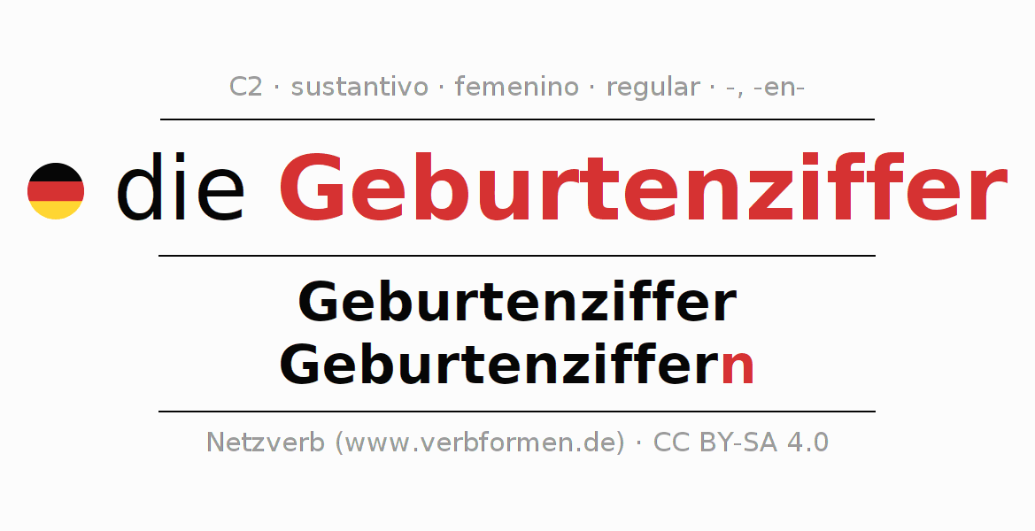 La declinación del sustantivo en forma de tabla con todas su formas: singular, plural y en los cuatro casos: nominativo (primer caso), genitivo (segundo caso), dativo (tercer caso) y acusativo (cuarto caso). Las construcciones gramaticales están representadas de forma clara en una tabla sinópica. La inflexión de los sustantivos es una ayuda durante tareas, exámenes, para cursos de alemán, la universidad, el estudio del alemán como lengua extranjera o como segundo idioma y para estudiantes adultos. La declinación correcta de las palabras es especialmente importante para los que aprenden el idioma alemán. Aquí encontraras más información acerca del tema Wiktionary Geburtenziffer y aquí también a través del Duden Geburtenziffer.