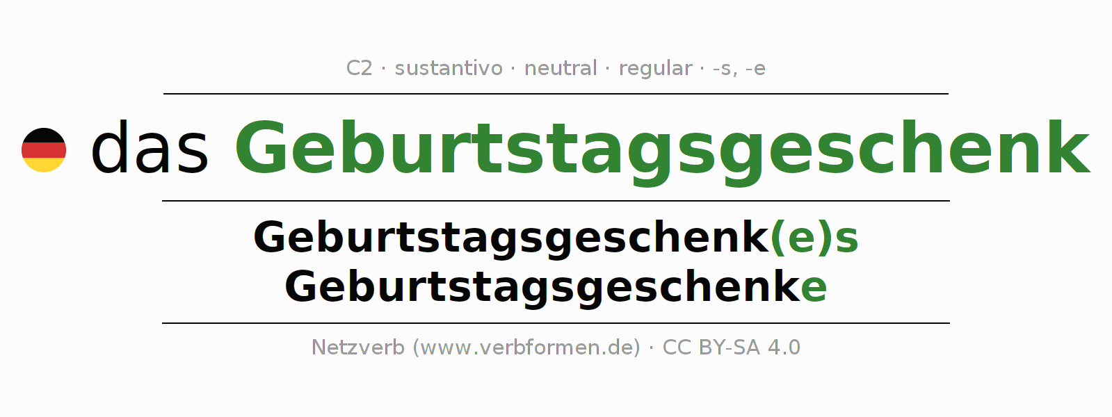 La declinación del sustantivo en forma de tabla con todas su formas: singular, plural y en los cuatro casos: nominativo (primer caso), genitivo (segundo caso), dativo (tercer caso) y acusativo (cuarto caso). Las construcciones gramaticales están representadas de forma clara en una tabla sinópica. La inflexión de los sustantivos es una ayuda durante tareas, exámenes, para cursos de alemán, la universidad, el estudio del alemán como lengua extranjera o como segundo idioma y para estudiantes adultos. La declinación correcta de las palabras es especialmente importante para los que aprenden el idioma alemán. Aquí encontraras más información acerca del tema Wiktionary Geburtstagsgeschenk y aquí también a través del Duden Geburtstagsgeschenk.
