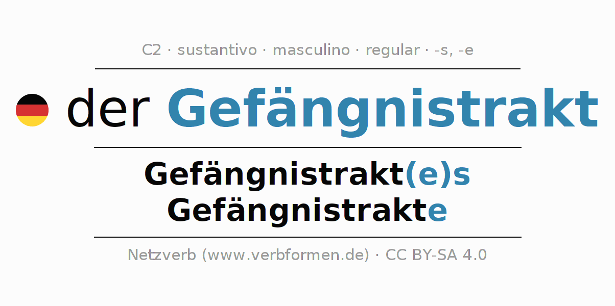 La declinación del sustantivo en forma de tabla con todas su formas: singular, plural y en los cuatro casos: nominativo (primer caso), genitivo (segundo caso), dativo (tercer caso) y acusativo (cuarto caso). Las construcciones gramaticales están representadas de forma clara en una tabla sinópica. La inflexión de los sustantivos es una ayuda durante tareas, exámenes, para cursos de alemán, la universidad, el estudio del alemán como lengua extranjera o como segundo idioma y para estudiantes adultos. La declinación correcta de las palabras es especialmente importante para los que aprenden el idioma alemán. Aquí encontraras más información acerca del tema Wiktionary Gefängnistrakt y aquí también a través del Duden Gefängnistrakt.