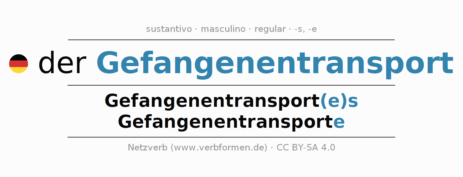 La declinación del sustantivo en forma de tabla con todas su formas: singular, plural y en los cuatro casos: nominativo (primer caso), genitivo (segundo caso), dativo (tercer caso) y acusativo (cuarto caso). Las construcciones gramaticales están representadas de forma clara en una tabla sinópica. La inflexión de los sustantivos es una ayuda durante tareas, exámenes, para cursos de alemán, la universidad, el estudio del alemán como lengua extranjera o como segundo idioma y para estudiantes adultos. La declinación correcta de las palabras es especialmente importante para los que aprenden el idioma alemán. Aquí encontraras más información acerca del tema Wiktionary Gefangenentransport y aquí también a través del Duden Gefangenentransport.