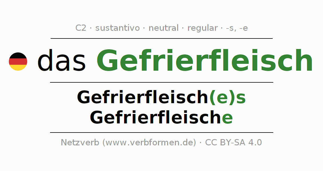 La declinación del sustantivo en forma de tabla con todas su formas: singular, plural y en los cuatro casos: nominativo (primer caso), genitivo (segundo caso), dativo (tercer caso) y acusativo (cuarto caso). Las construcciones gramaticales están representadas de forma clara en una tabla sinópica. La inflexión de los sustantivos es una ayuda durante tareas, exámenes, para cursos de alemán, la universidad, el estudio del alemán como lengua extranjera o como segundo idioma y para estudiantes adultos. La declinación correcta de las palabras es especialmente importante para los que aprenden el idioma alemán. Aquí encontraras más información acerca del tema Wiktionary Gefrierfleisch y aquí también a través del Duden Gefrierfleisch.