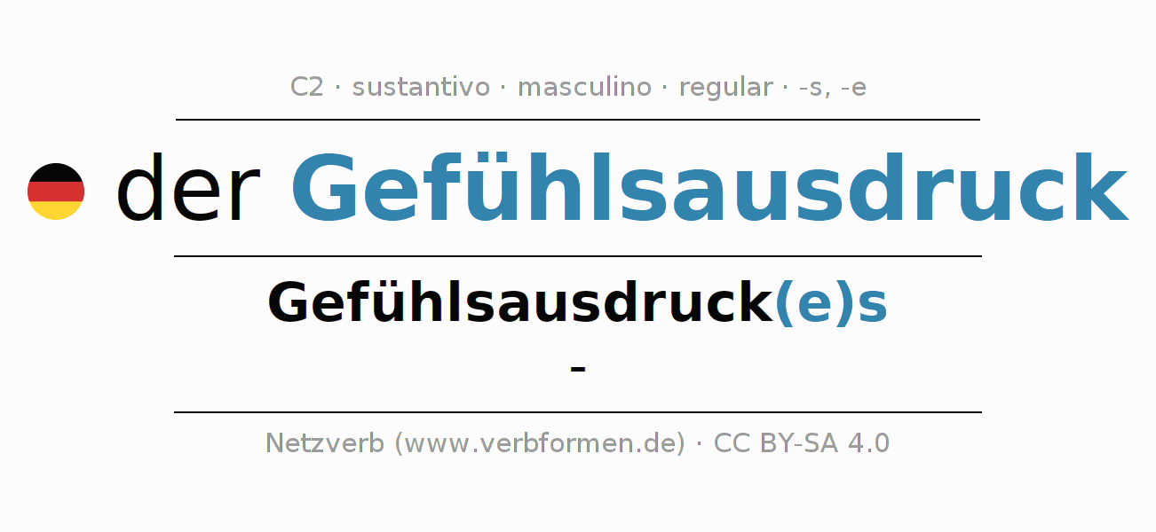 La declinación del sustantivo en forma de tabla con todas su formas: singular, plural y en los cuatro casos: nominativo (primer caso), genitivo (segundo caso), dativo (tercer caso) y acusativo (cuarto caso). Las construcciones gramaticales están representadas de forma clara en una tabla sinópica. La inflexión de los sustantivos es una ayuda durante tareas, exámenes, para cursos de alemán, la universidad, el estudio del alemán como lengua extranjera o como segundo idioma y para estudiantes adultos. La declinación correcta de las palabras es especialmente importante para los que aprenden el idioma alemán. Aquí encontraras más información acerca del tema Wiktionary Gefühlsausdruck y aquí también a través del Duden Gefühlsausdruck.