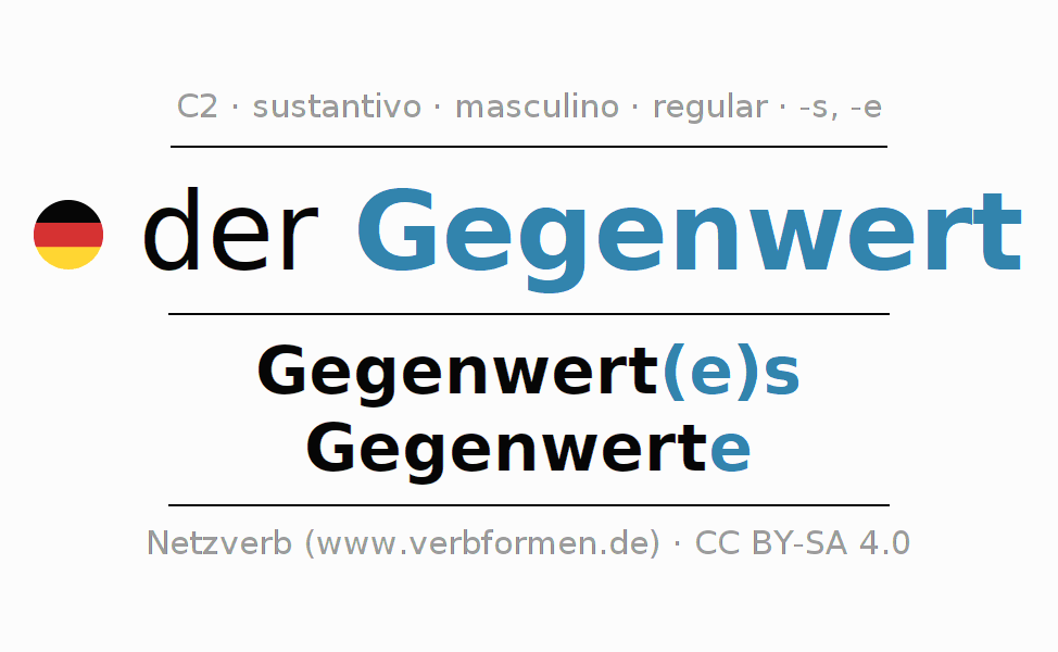 La declinación del sustantivo en forma de tabla con todas su formas: singular, plural y en los cuatro casos: nominativo (primer caso), genitivo (segundo caso), dativo (tercer caso) y acusativo (cuarto caso). Las construcciones gramaticales están representadas de forma clara en una tabla sinópica. La inflexión de los sustantivos es una ayuda durante tareas, exámenes, para cursos de alemán, la universidad, el estudio del alemán como lengua extranjera o como segundo idioma y para estudiantes adultos. La declinación correcta de las palabras es especialmente importante para los que aprenden el idioma alemán. Aquí encontraras más información acerca del tema Wiktionary Gegenwert y aquí también a través del Duden Gegenwert.