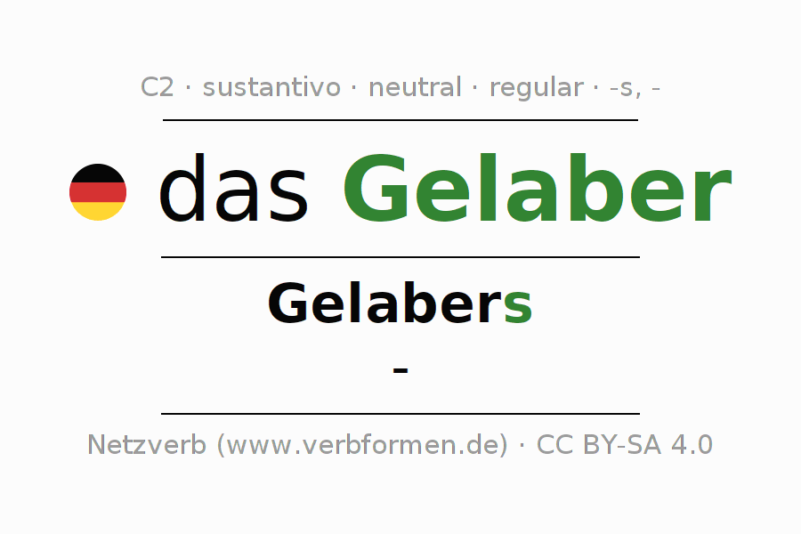 La declinación del sustantivoGelaber (babosería, charlas superficiales) se encuentra en genitivoGelabers del singular y en el nominativo- del plural. El sustantivo Gelaber se conjuga de forma fuerte (irregular) con estas terminaciones s/-. No permite construcciones en plural. El género gramatical de Gelaber es neutro y por eso se requiere el artículo definido ‘das’. Aquí puedes declinar no solamente Gelaber sino también todos los sustantivos alemanes . Este sustantivo pertenece al vocabulario necesario para pasar el examen "Zertifikat Deutsch" o para el nivel C2. Comentarios ☆