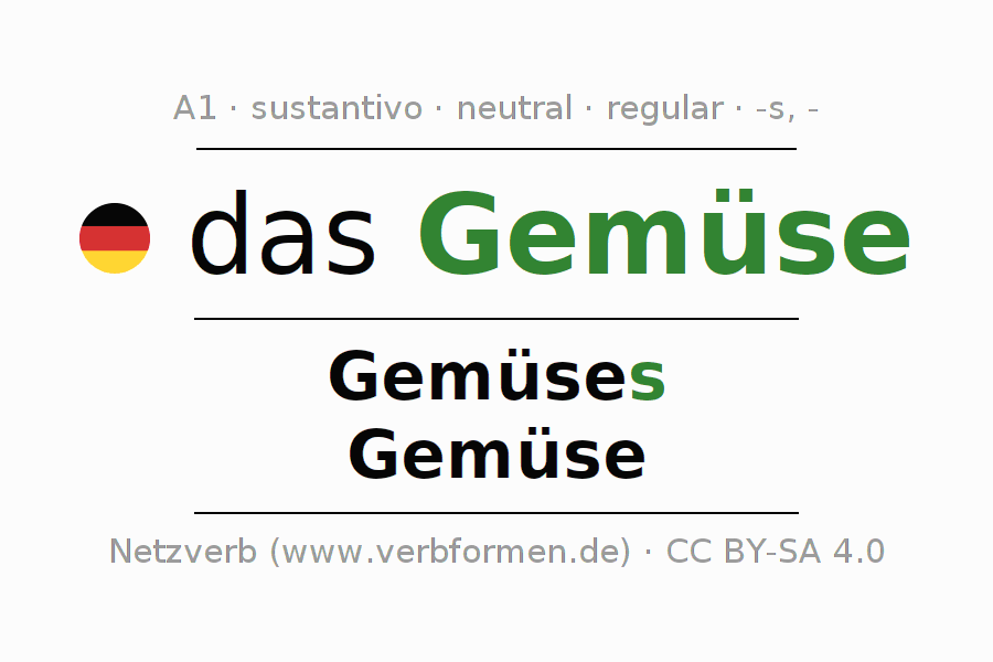 La declinación del sustantivo en forma de tabla con todas su formas: singular, plural y en los cuatro casos: nominativo (primer caso), genitivo (segundo caso), dativo (tercer caso) y acusativo (cuarto caso). Las construcciones gramaticales están representadas de forma clara en una tabla sinópica. La inflexión de los sustantivos es una ayuda durante tareas, exámenes, para cursos de alemán, la universidad, el estudio del alemán como lengua extranjera o como segundo idioma y para estudiantes adultos. La declinación correcta de las palabras es especialmente importante para los que aprenden el idioma alemán. Aquí encontraras más información acerca del tema Wiktionary Gemüse y aquí también a través del Duden Gemüse.