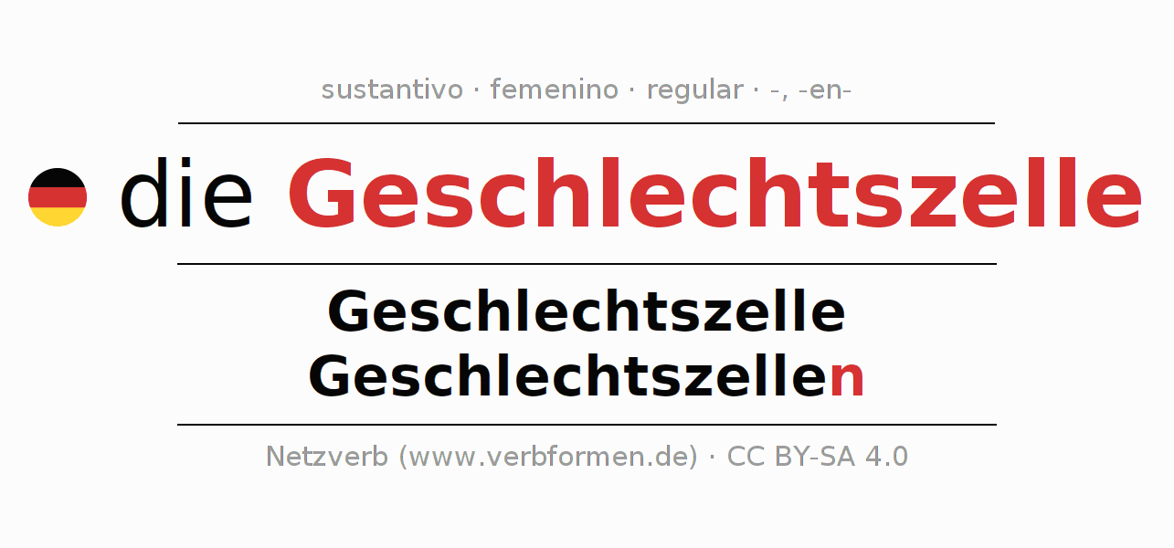 La declinación del sustantivo en forma de tabla con todas su formas: singular, plural y en los cuatro casos: nominativo (primer caso), genitivo (segundo caso), dativo (tercer caso) y acusativo (cuarto caso). Las construcciones gramaticales están representadas de forma clara en una tabla sinópica. La inflexión de los sustantivos es una ayuda durante tareas, exámenes, para cursos de alemán, la universidad, el estudio del alemán como lengua extranjera o como segundo idioma y para estudiantes adultos. La declinación correcta de las palabras es especialmente importante para los que aprenden el idioma alemán. Aquí encontraras más información acerca del tema Wiktionary Geschlechtszelle y aquí también a través del Duden Geschlechtszelle.
