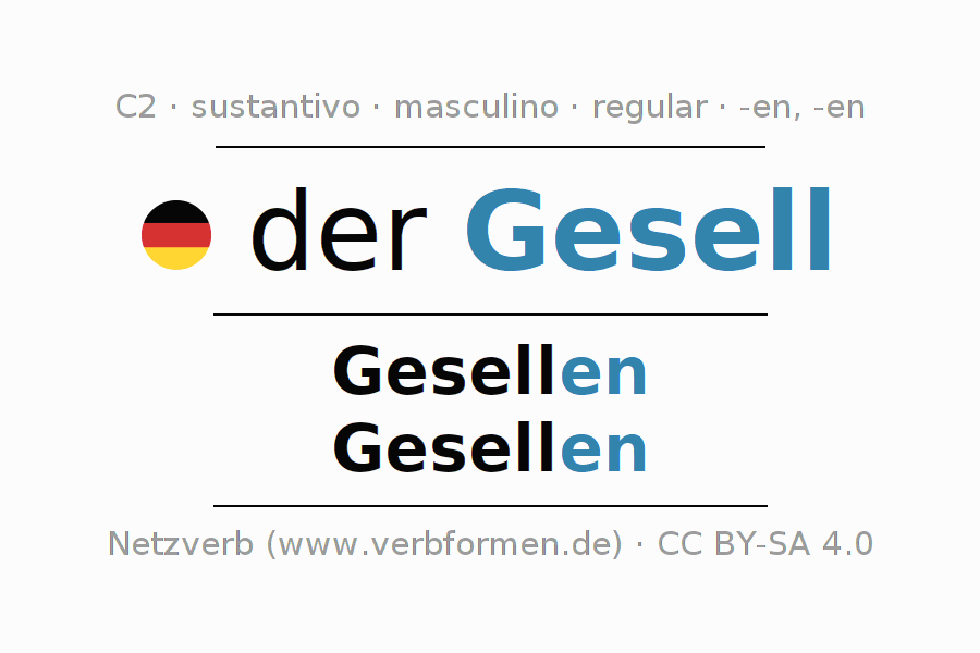 La declinación del sustantivo en forma de tabla con todas su formas: singular, plural y en los cuatro casos: nominativo (primer caso), genitivo (segundo caso), dativo (tercer caso) y acusativo (cuarto caso). Las construcciones gramaticales están representadas de forma clara en una tabla sinópica. La inflexión de los sustantivos es una ayuda durante tareas, exámenes, para cursos de alemán, la universidad, el estudio del alemán como lengua extranjera o como segundo idioma y para estudiantes adultos. La declinación correcta de las palabras es especialmente importante para los que aprenden el idioma alemán. Aquí encontraras más información acerca del tema Wiktionary Gesell y aquí también a través del Duden Gesell.