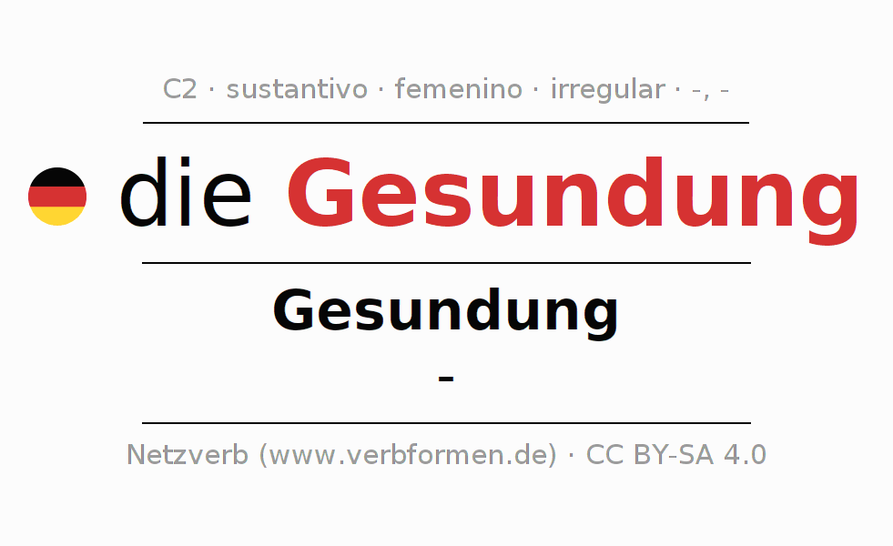 La declinación del sustantivo en forma de tabla con todas su formas: singular, plural y en los cuatro casos: nominativo (primer caso), genitivo (segundo caso), dativo (tercer caso) y acusativo (cuarto caso). Las construcciones gramaticales están representadas de forma clara en una tabla sinópica. La inflexión de los sustantivos es una ayuda durante tareas, exámenes, para cursos de alemán, la universidad, el estudio del alemán como lengua extranjera o como segundo idioma y para estudiantes adultos. La declinación correcta de las palabras es especialmente importante para los que aprenden el idioma alemán. Aquí encontraras más información acerca del tema Wiktionary Gesundung y aquí también a través del Duden Gesundung.