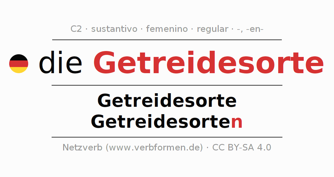 La declinación del sustantivo en forma de tabla con todas su formas: singular, plural y en los cuatro casos: nominativo (primer caso), genitivo (segundo caso), dativo (tercer caso) y acusativo (cuarto caso). Las construcciones gramaticales están representadas de forma clara en una tabla sinópica. La inflexión de los sustantivos es una ayuda durante tareas, exámenes, para cursos de alemán, la universidad, el estudio del alemán como lengua extranjera o como segundo idioma y para estudiantes adultos. La declinación correcta de las palabras es especialmente importante para los que aprenden el idioma alemán. Aquí encontraras más información acerca del tema Wiktionary Getreidesorte y aquí también a través del Duden Getreidesorte.