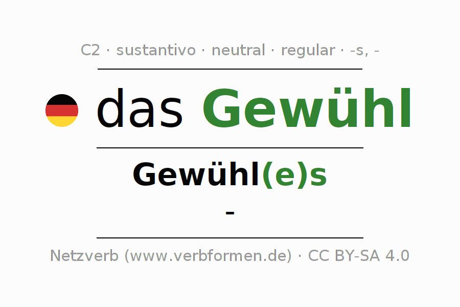 La declinación del sustantivoGewühl (multitud, aglomeración) se encuentra en genitivoGewühl(e)s del singular y en el nominativo- del plural. El sustantivo Gewühl se conjuga de forma fuerte (irregular) con estas terminaciones es/-. No permite construcciones en plural. El género gramatical de Gewühl es neutro y por eso se requiere el artículo definido ‘das’. Aquí puedes declinar no solamente Gewühl sino también todos los sustantivos alemanes . Este sustantivo pertenece al vocabulario necesario para pasar el examen "Zertifikat Deutsch" o para el nivel C2. Comentarios ☆