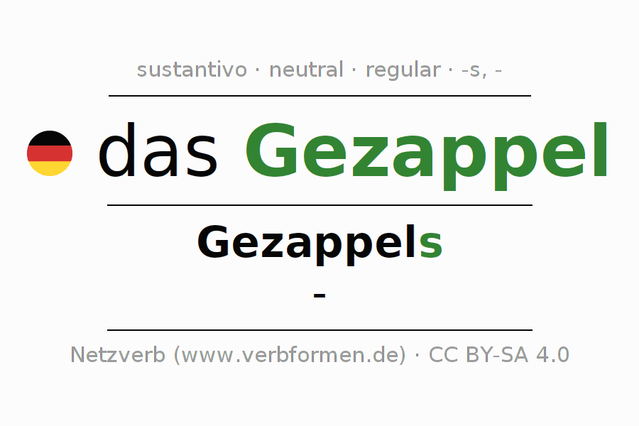 La declinación del sustantivoGezappel (agitación, movimientos inquietos) se encuentra en genitivoGezappels del singular y en el nominativo- del plural. El sustantivo Gezappel se conjuga de forma fuerte (irregular) con estas terminaciones s/-. No permite construcciones en plural. El género gramatical de Gezappel es neutro y por eso se requiere el artículo definido ‘das’. Aquí puedes declinar no solamente Gezappel sino también todos los sustantivos alemanes . Comentarios ☆