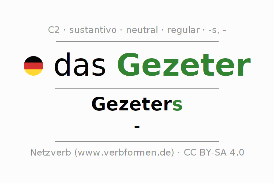 La declinación del sustantivoGezeter (aspaviento, griterío) se encuentra en genitivoGezeters del singular y en el nominativo- del plural. El sustantivo Gezeter se conjuga de forma fuerte (irregular) con estas terminaciones s/-. No permite construcciones en plural. El género gramatical de Gezeter es neutro y por eso se requiere el artículo definido ‘das’. Aquí puedes declinar no solamente Gezeter sino también todos los sustantivos alemanes . Este sustantivo pertenece al vocabulario necesario para pasar el examen "Zertifikat Deutsch" o para el nivel C2. Comentarios ☆