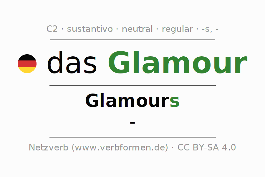 La declinación del sustantivoGlamour (esplendor, glamur) se encuentra en genitivoGlamours del singular y en el nominativo- del plural. El sustantivo Glamour se conjuga de forma fuerte (irregular) con estas terminaciones s/-. No permite construcciones en plural. El género gramatical de Glamour es neutro y por eso se requiere el artículo definido ‘das’. Pero el sustantivo puede ser utilizado también con otros géneros y otros artículos. Aquí puedes declinar no solamente Glamour sino también todos los sustantivos alemanes . Este sustantivo pertenece al vocabulario necesario para pasar el examen "Zertifikat Deutsch" o para el nivel C2. Comentarios ☆