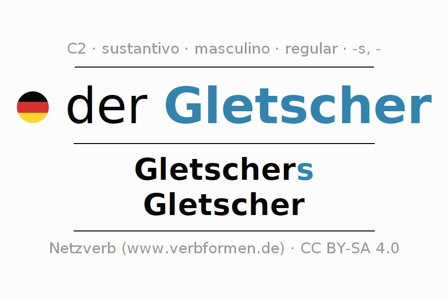 La declinación del sustantivo en forma de tabla con todas su formas: singular, plural y en los cuatro casos: nominativo (primer caso), genitivo (segundo caso), dativo (tercer caso) y acusativo (cuarto caso). Las construcciones gramaticales están representadas de forma clara en una tabla sinópica. La inflexión de los sustantivos es una ayuda durante tareas, exámenes, para cursos de alemán, la universidad, el estudio del alemán como lengua extranjera o como segundo idioma y para estudiantes adultos. La declinación correcta de las palabras es especialmente importante para los que aprenden el idioma alemán. Aquí encontraras más información acerca del tema Wiktionary Gletscher y aquí también a través del Duden Gletscher.