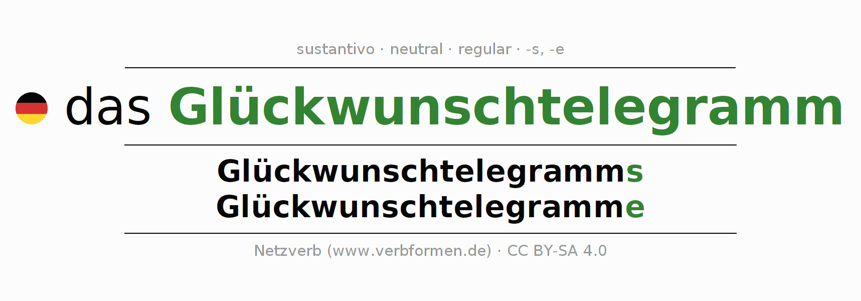 La declinación del sustantivo en forma de tabla con todas su formas: singular, plural y en los cuatro casos: nominativo (primer caso), genitivo (segundo caso), dativo (tercer caso) y acusativo (cuarto caso). Las construcciones gramaticales están representadas de forma clara en una tabla sinópica. La inflexión de los sustantivos es una ayuda durante tareas, exámenes, para cursos de alemán, la universidad, el estudio del alemán como lengua extranjera o como segundo idioma y para estudiantes adultos. La declinación correcta de las palabras es especialmente importante para los que aprenden el idioma alemán. Aquí encontraras más información acerca del tema Wiktionary Glückwunschtelegramm y aquí también a través del Duden Glückwunschtelegramm.