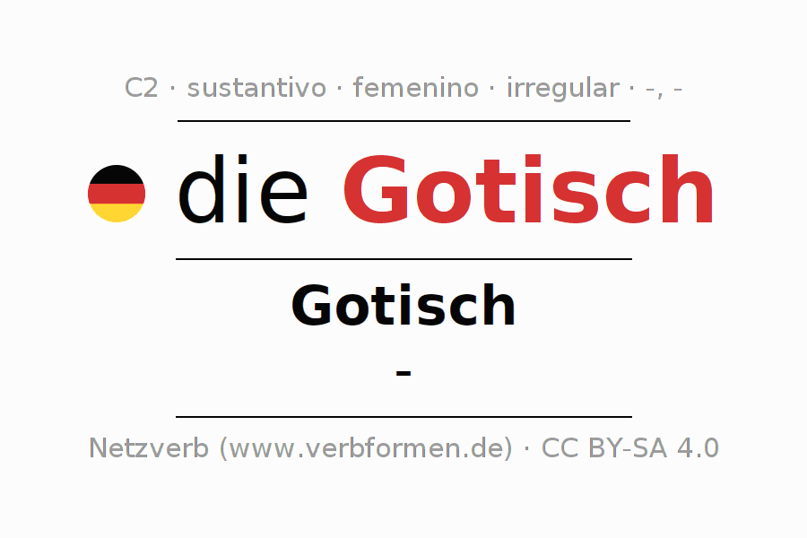 La declinación del sustantivo en forma de tabla con todas su formas: singular, plural y en los cuatro casos: nominativo (primer caso), genitivo (segundo caso), dativo (tercer caso) y acusativo (cuarto caso). Las construcciones gramaticales están representadas de forma clara en una tabla sinópica. La inflexión de los sustantivos es una ayuda durante tareas, exámenes, para cursos de alemán, la universidad, el estudio del alemán como lengua extranjera o como segundo idioma y para estudiantes adultos. La declinación correcta de las palabras es especialmente importante para los que aprenden el idioma alemán. Aquí encontraras más información acerca del tema Wiktionary die Gotisch y aquí también a través del Duden die Gotisch.