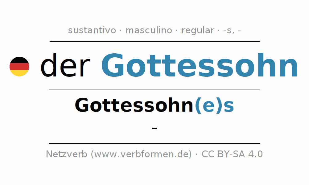 La declinación del sustantivo en forma de tabla con todas su formas: singular, plural y en los cuatro casos: nominativo (primer caso), genitivo (segundo caso), dativo (tercer caso) y acusativo (cuarto caso). Las construcciones gramaticales están representadas de forma clara en una tabla sinópica. La inflexión de los sustantivos es una ayuda durante tareas, exámenes, para cursos de alemán, la universidad, el estudio del alemán como lengua extranjera o como segundo idioma y para estudiantes adultos. La declinación correcta de las palabras es especialmente importante para los que aprenden el idioma alemán. Aquí encontraras más información acerca del tema Wiktionary Gottessohn y aquí también a través del Duden Gottessohn.