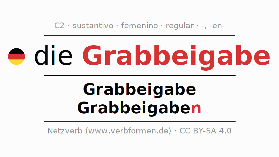 La declinación del sustantivoGrabbeigabe (ajuar funerario, objeto funerario) se encuentra en genitivoGrabbeigabe del singular y en el nominativoGrabbeigaben del plural. El sustantivo Grabbeigabe se declina de forma débil con las terminaciones -/n. El género gramatical de Grabbeigabe es femenino y por eso se requiere el artículo definido ‘die’. Aquí puedes declinar no solamente Grabbeigabe sino también todos los sustantivos alemanes . Este sustantivo pertenece al vocabulario necesario para pasar el examen "Zertifikat Deutsch" o para el nivel C2. Comentarios ☆