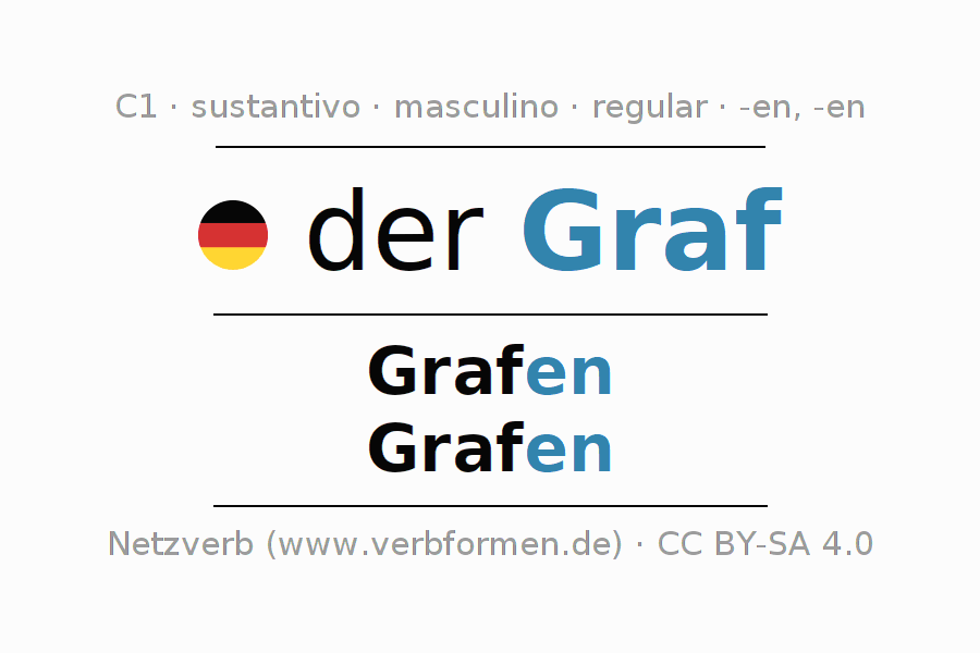 La declinación del sustantivo en forma de tabla con todas su formas: singular, plural y en los cuatro casos: nominativo (primer caso), genitivo (segundo caso), dativo (tercer caso) y acusativo (cuarto caso). Las construcciones gramaticales están representadas de forma clara en una tabla sinópica. La inflexión de los sustantivos es una ayuda durante tareas, exámenes, para cursos de alemán, la universidad, el estudio del alemán como lengua extranjera o como segundo idioma y para estudiantes adultos. La declinación correcta de las palabras es especialmente importante para los que aprenden el idioma alemán. Aquí encontraras más información acerca del tema Wiktionary Graf y aquí también a través del Duden Graf.