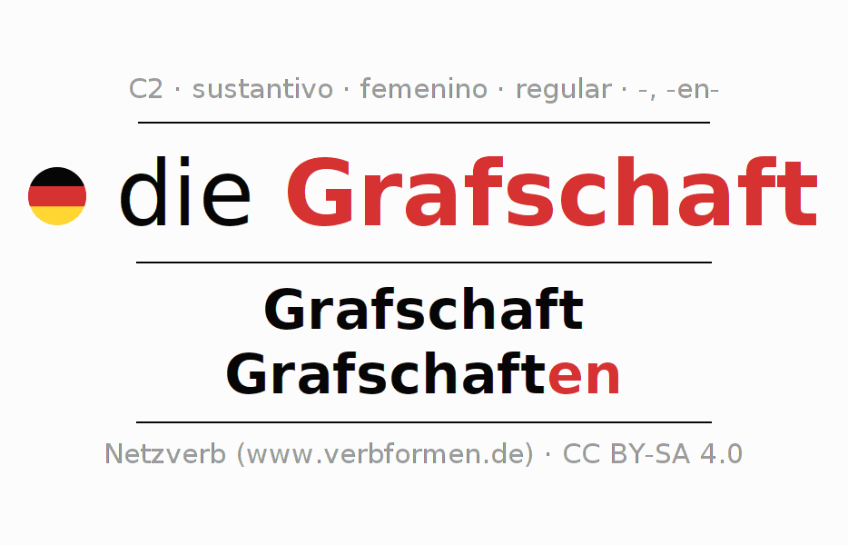 La declinación del sustantivo en forma de tabla con todas su formas: singular, plural y en los cuatro casos: nominativo (primer caso), genitivo (segundo caso), dativo (tercer caso) y acusativo (cuarto caso). Las construcciones gramaticales están representadas de forma clara en una tabla sinópica. La inflexión de los sustantivos es una ayuda durante tareas, exámenes, para cursos de alemán, la universidad, el estudio del alemán como lengua extranjera o como segundo idioma y para estudiantes adultos. La declinación correcta de las palabras es especialmente importante para los que aprenden el idioma alemán. Aquí encontraras más información acerca del tema Wiktionary Grafschaft y aquí también a través del Duden Grafschaft.