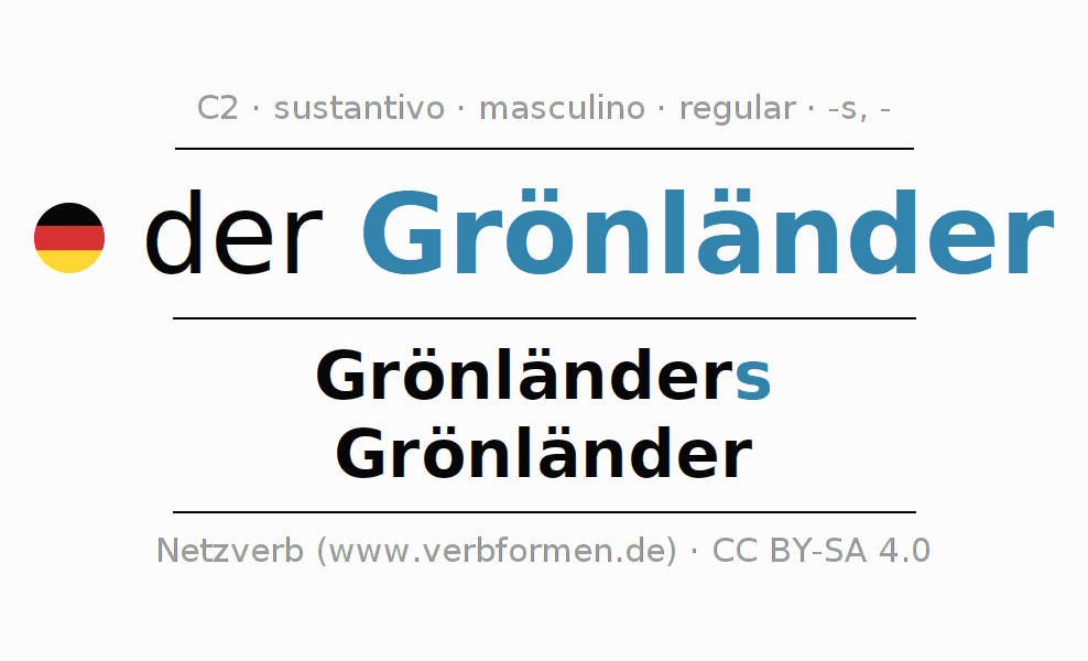 La declinación del sustantivo en forma de tabla con todas su formas: singular, plural y en los cuatro casos: nominativo (primer caso), genitivo (segundo caso), dativo (tercer caso) y acusativo (cuarto caso). Las construcciones gramaticales están representadas de forma clara en una tabla sinópica. La inflexión de los sustantivos es una ayuda durante tareas, exámenes, para cursos de alemán, la universidad, el estudio del alemán como lengua extranjera o como segundo idioma y para estudiantes adultos. La declinación correcta de las palabras es especialmente importante para los que aprenden el idioma alemán. Aquí encontraras más información acerca del tema Wiktionary Grönländer y aquí también a través del Duden Grönländer.