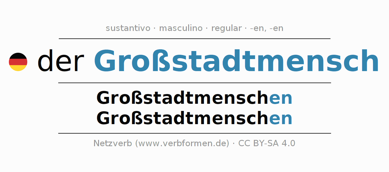 La declinación del sustantivo en forma de tabla con todas su formas: singular, plural y en los cuatro casos: nominativo (primer caso), genitivo (segundo caso), dativo (tercer caso) y acusativo (cuarto caso). Las construcciones gramaticales están representadas de forma clara en una tabla sinópica. La inflexión de los sustantivos es una ayuda durante tareas, exámenes, para cursos de alemán, la universidad, el estudio del alemán como lengua extranjera o como segundo idioma y para estudiantes adultos. La declinación correcta de las palabras es especialmente importante para los que aprenden el idioma alemán. Aquí encontraras más información acerca del tema Wiktionary Großstadtmensch y aquí también a través del Duden Großstadtmensch.