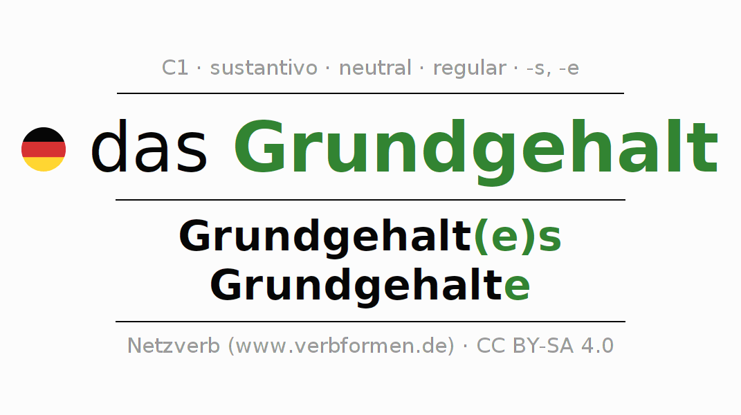 La declinación del sustantivo en forma de tabla con todas su formas: singular, plural y en los cuatro casos: nominativo (primer caso), genitivo (segundo caso), dativo (tercer caso) y acusativo (cuarto caso). Las construcciones gramaticales están representadas de forma clara en una tabla sinópica. La inflexión de los sustantivos es una ayuda durante tareas, exámenes, para cursos de alemán, la universidad, el estudio del alemán como lengua extranjera o como segundo idioma y para estudiantes adultos. La declinación correcta de las palabras es especialmente importante para los que aprenden el idioma alemán. Aquí encontraras más información acerca del tema Wiktionary das Grundgehalt y aquí también a través del Duden das Grundgehalt.