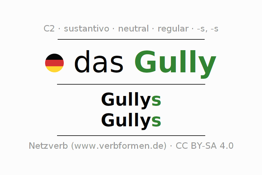 La declinación del sustantivoGully (sumidero, desagüe) se encuentra en genitivoGullys del singular y en el nominativoGullys del plural. El sustantivo Gully se conjuga de forma fuerte (irregular) con estas terminaciones s/s. El género gramatical de Gully es neutro y por eso se requiere el artículo definido ‘das’. Pero el sustantivo puede ser utilizado también con otros géneros y otros artículos. Aquí puedes declinar no solamente Gully sino también todos los sustantivos alemanes . Este sustantivo pertenece al vocabulario necesario para pasar el examen "Zertifikat Deutsch" o para el nivel C2. Comentarios ☆