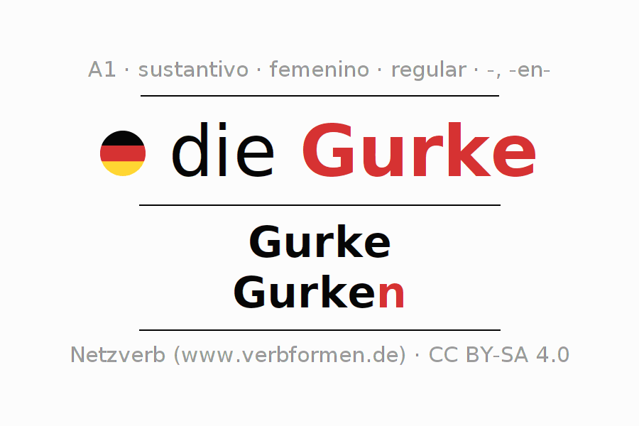 La declinación del sustantivo en forma de tabla con todas su formas: singular, plural y en los cuatro casos: nominativo (primer caso), genitivo (segundo caso), dativo (tercer caso) y acusativo (cuarto caso). Las construcciones gramaticales están representadas de forma clara en una tabla sinópica. La inflexión de los sustantivos es una ayuda durante tareas, exámenes, para cursos de alemán, la universidad, el estudio del alemán como lengua extranjera o como segundo idioma y para estudiantes adultos. La declinación correcta de las palabras es especialmente importante para los que aprenden el idioma alemán. Aquí encontraras más información acerca del tema Wiktionary Gurke y aquí también a través del Duden Gurke.