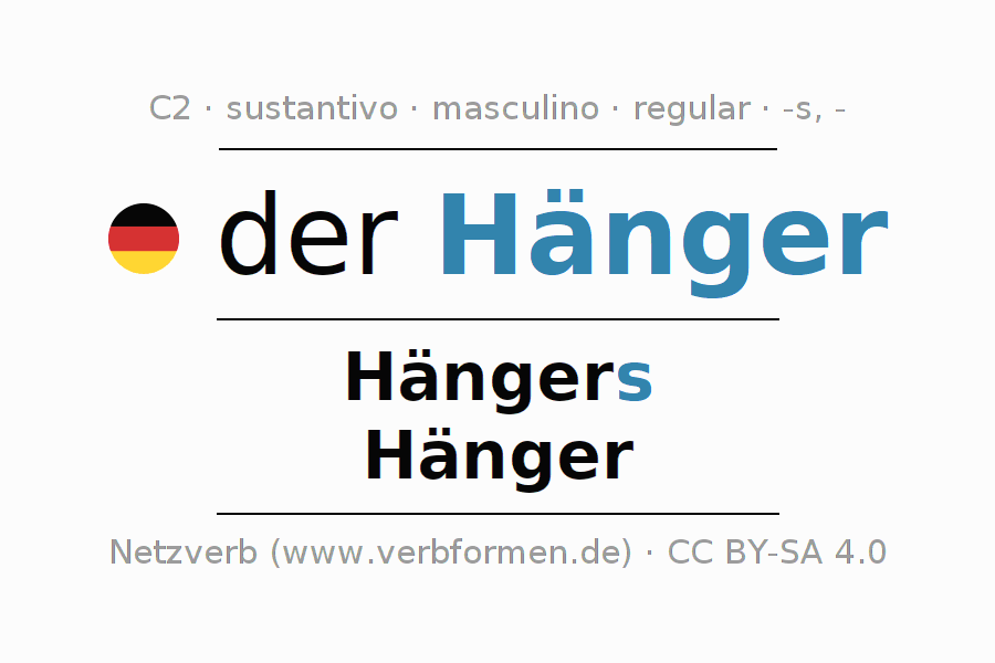 La declinación del sustantivo en forma de tabla con todas su formas: singular, plural y en los cuatro casos: nominativo (primer caso), genitivo (segundo caso), dativo (tercer caso) y acusativo (cuarto caso). Las construcciones gramaticales están representadas de forma clara en una tabla sinópica. La inflexión de los sustantivos es una ayuda durante tareas, exámenes, para cursos de alemán, la universidad, el estudio del alemán como lengua extranjera o como segundo idioma y para estudiantes adultos. La declinación correcta de las palabras es especialmente importante para los que aprenden el idioma alemán. Aquí encontraras más información acerca del tema Wiktionary Hänger y aquí también a través del Duden Hänger.