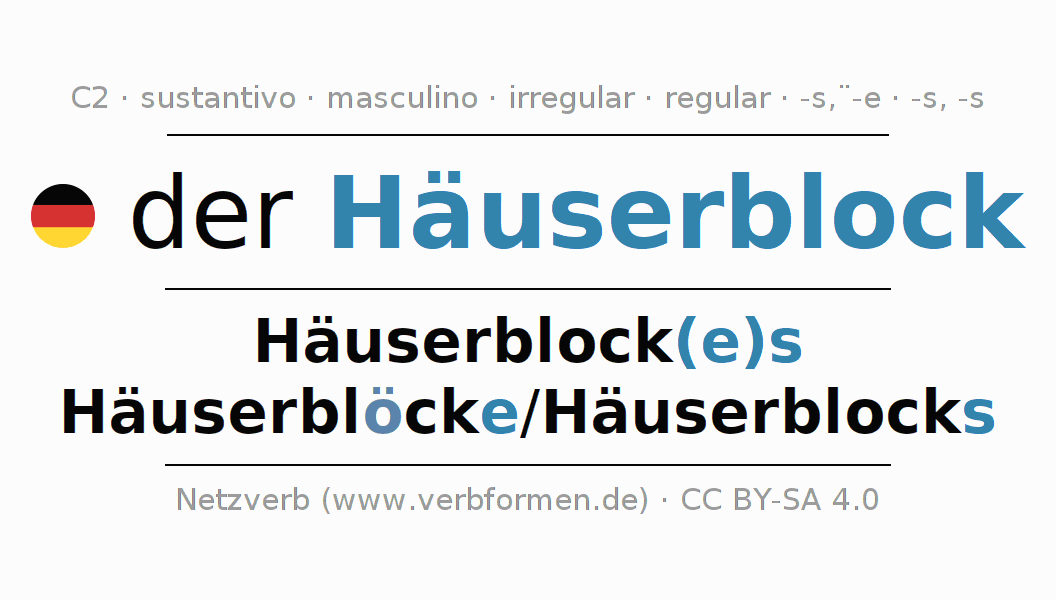 La declinación del sustantivo en forma de tabla con todas su formas: singular, plural y en los cuatro casos: nominativo (primer caso), genitivo (segundo caso), dativo (tercer caso) y acusativo (cuarto caso). Las construcciones gramaticales están representadas de forma clara en una tabla sinópica. La inflexión de los sustantivos es una ayuda durante tareas, exámenes, para cursos de alemán, la universidad, el estudio del alemán como lengua extranjera o como segundo idioma y para estudiantes adultos. La declinación correcta de las palabras es especialmente importante para los que aprenden el idioma alemán. Aquí encontraras más información acerca del tema Wiktionary Häuserblock y aquí también a través del Duden Häuserblock.