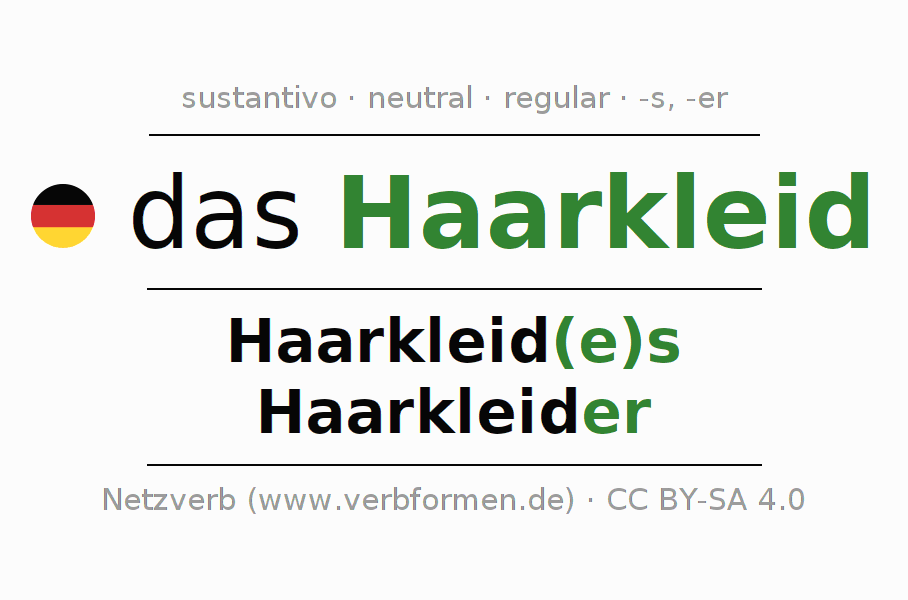 La declinación del sustantivo en forma de tabla con todas su formas: singular, plural y en los cuatro casos: nominativo (primer caso), genitivo (segundo caso), dativo (tercer caso) y acusativo (cuarto caso). Las construcciones gramaticales están representadas de forma clara en una tabla sinópica. La inflexión de los sustantivos es una ayuda durante tareas, exámenes, para cursos de alemán, la universidad, el estudio del alemán como lengua extranjera o como segundo idioma y para estudiantes adultos. La declinación correcta de las palabras es especialmente importante para los que aprenden el idioma alemán. Aquí encontraras más información acerca del tema Wiktionary Haarkleid y aquí también a través del Duden Haarkleid.
