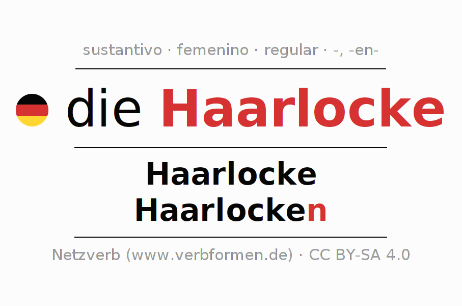 La declinación del sustantivo en forma de tabla con todas su formas: singular, plural y en los cuatro casos: nominativo (primer caso), genitivo (segundo caso), dativo (tercer caso) y acusativo (cuarto caso). Las construcciones gramaticales están representadas de forma clara en una tabla sinópica. La inflexión de los sustantivos es una ayuda durante tareas, exámenes, para cursos de alemán, la universidad, el estudio del alemán como lengua extranjera o como segundo idioma y para estudiantes adultos. La declinación correcta de las palabras es especialmente importante para los que aprenden el idioma alemán. Aquí encontraras más información acerca del tema Wiktionary Haarlocke y aquí también a través del Duden Haarlocke.