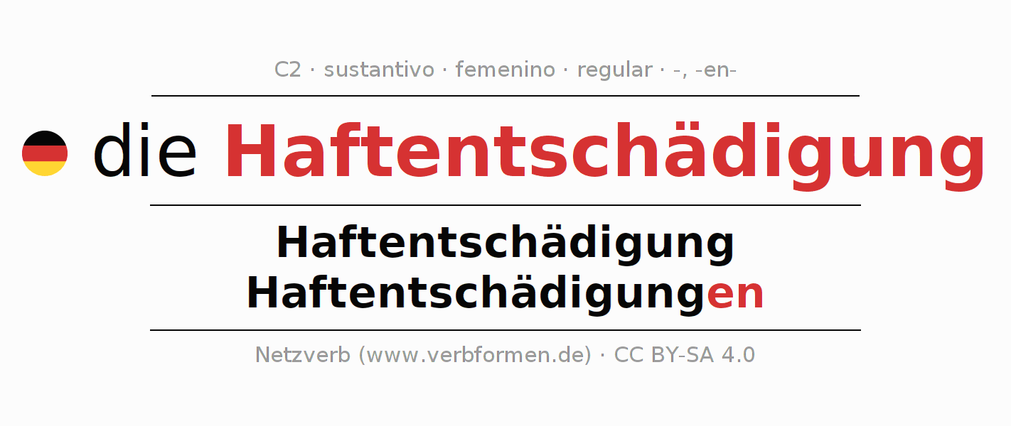 La declinación del sustantivo en forma de tabla con todas su formas: singular, plural y en los cuatro casos: nominativo (primer caso), genitivo (segundo caso), dativo (tercer caso) y acusativo (cuarto caso). Las construcciones gramaticales están representadas de forma clara en una tabla sinópica. La inflexión de los sustantivos es una ayuda durante tareas, exámenes, para cursos de alemán, la universidad, el estudio del alemán como lengua extranjera o como segundo idioma y para estudiantes adultos. La declinación correcta de las palabras es especialmente importante para los que aprenden el idioma alemán. Aquí encontraras más información acerca del tema Wiktionary Haftentschädigung y aquí también a través del Duden Haftentschädigung.