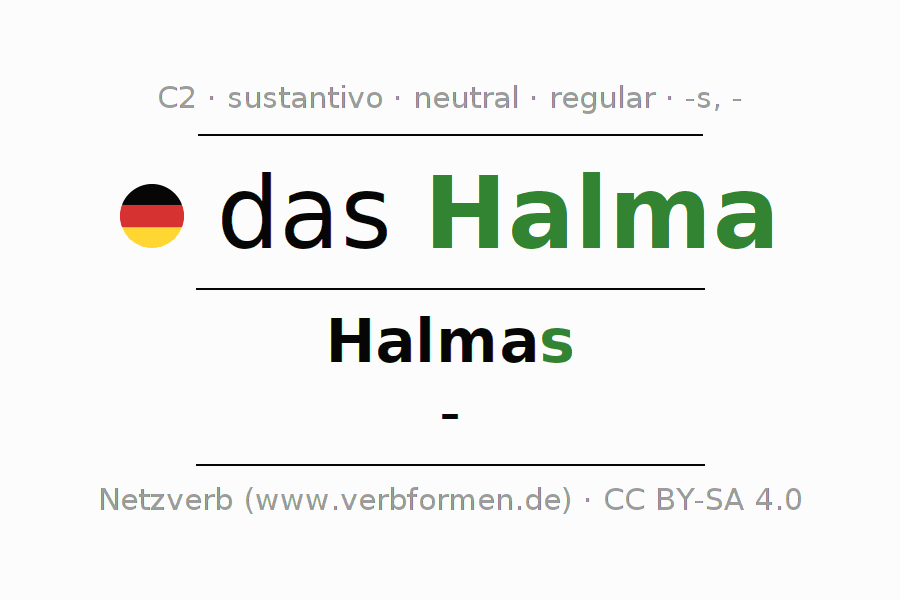 La declinación del sustantivoHalma (halma, damas chinas) se encuentra en genitivoHalmas del singular y en el nominativo- del plural. El sustantivo Halma se conjuga de forma fuerte (irregular) con estas terminaciones s/-. No permite construcciones en plural. El género gramatical de Halma es neutro y por eso se requiere el artículo definido ‘das’. Aquí puedes declinar no solamente Halma sino también todos los sustantivos alemanes . Este sustantivo pertenece al vocabulario necesario para pasar el examen "Zertifikat Deutsch" o para el nivel C2. Comentarios ☆
