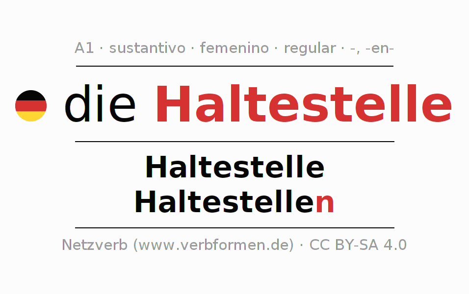 La declinación del sustantivo en forma de tabla con todas su formas: singular, plural y en los cuatro casos: nominativo (primer caso), genitivo (segundo caso), dativo (tercer caso) y acusativo (cuarto caso). Las construcciones gramaticales están representadas de forma clara en una tabla sinópica. La inflexión de los sustantivos es una ayuda durante tareas, exámenes, para cursos de alemán, la universidad, el estudio del alemán como lengua extranjera o como segundo idioma y para estudiantes adultos. La declinación correcta de las palabras es especialmente importante para los que aprenden el idioma alemán. Aquí encontraras más información acerca del tema Wiktionary Haltestelle y aquí también a través del Duden Haltestelle.