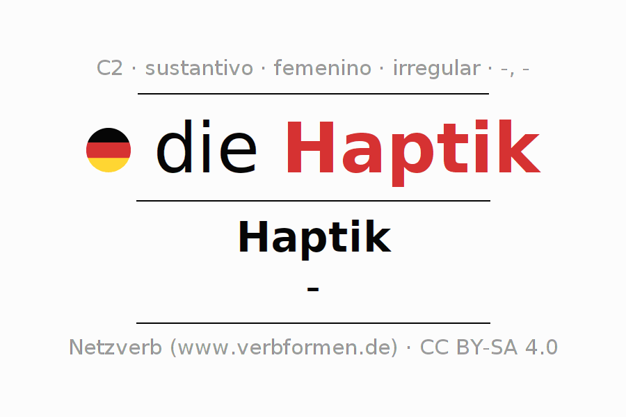 La declinación del sustantivoHaptik (tacto, háptica) se encuentra en genitivoHaptik del singular y en el nominativo- del plural. El sustantivo Haptik se declina con las terminaciones -/-. No permite construcciones en plural. El género gramatical de Haptik es femenino y por eso se requiere el artículo definido ‘die’. Aquí puedes declinar no solamente Haptik sino también todos los sustantivos alemanes . Este sustantivo pertenece al vocabulario necesario para pasar el examen "Zertifikat Deutsch" o para el nivel C2. Comentarios ☆