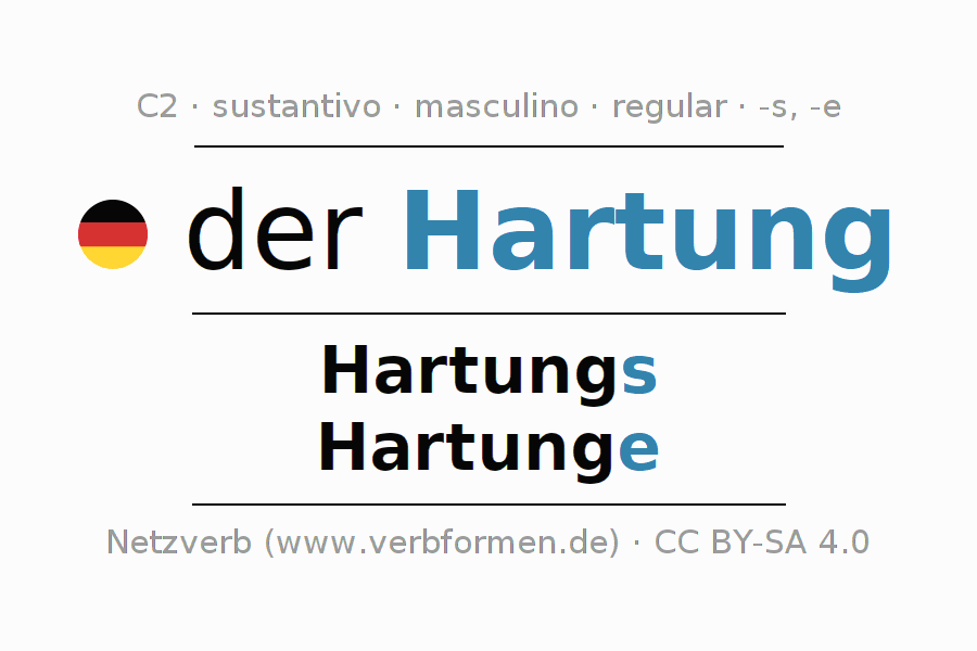 La declinación del sustantivo en forma de tabla con todas su formas: singular, plural y en los cuatro casos: nominativo (primer caso), genitivo (segundo caso), dativo (tercer caso) y acusativo (cuarto caso). Las construcciones gramaticales están representadas de forma clara en una tabla sinópica. La inflexión de los sustantivos es una ayuda durante tareas, exámenes, para cursos de alemán, la universidad, el estudio del alemán como lengua extranjera o como segundo idioma y para estudiantes adultos. La declinación correcta de las palabras es especialmente importante para los que aprenden el idioma alemán. Aquí encontraras más información acerca del tema Wiktionary Hartung y aquí también a través del Duden Hartung.