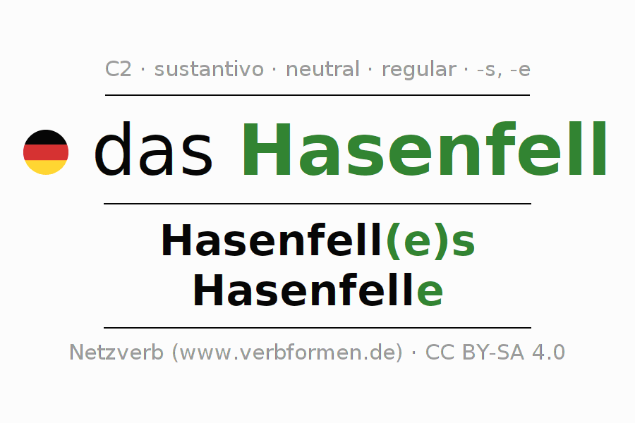 La declinación del sustantivo en forma de tabla con todas su formas: singular, plural y en los cuatro casos: nominativo (primer caso), genitivo (segundo caso), dativo (tercer caso) y acusativo (cuarto caso). Las construcciones gramaticales están representadas de forma clara en una tabla sinópica. La inflexión de los sustantivos es una ayuda durante tareas, exámenes, para cursos de alemán, la universidad, el estudio del alemán como lengua extranjera o como segundo idioma y para estudiantes adultos. La declinación correcta de las palabras es especialmente importante para los que aprenden el idioma alemán. Aquí encontraras más información acerca del tema Wiktionary Hasenfell y aquí también a través del Duden Hasenfell.