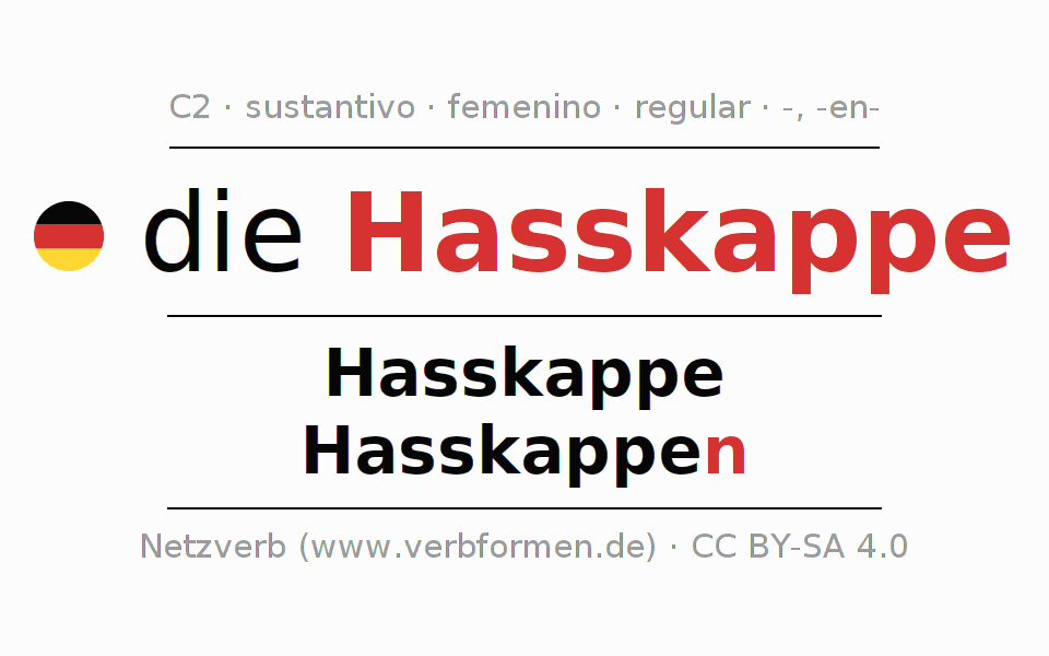 La declinación del sustantivo en forma de tabla con todas su formas: singular, plural y en los cuatro casos: nominativo (primer caso), genitivo (segundo caso), dativo (tercer caso) y acusativo (cuarto caso). Las construcciones gramaticales están representadas de forma clara en una tabla sinópica. La inflexión de los sustantivos es una ayuda durante tareas, exámenes, para cursos de alemán, la universidad, el estudio del alemán como lengua extranjera o como segundo idioma y para estudiantes adultos. La declinación correcta de las palabras es especialmente importante para los que aprenden el idioma alemán. Aquí encontraras más información acerca del tema Wiktionary Hasskappe y aquí también a través del Duden Hasskappe.