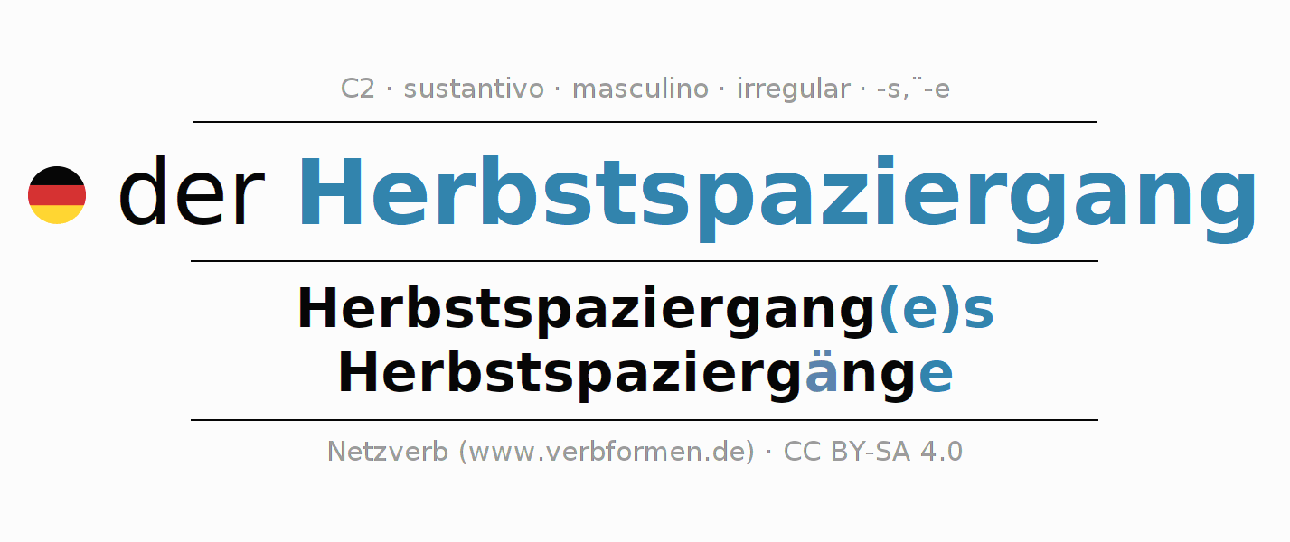 La declinación del sustantivo en forma de tabla con todas su formas: singular, plural y en los cuatro casos: nominativo (primer caso), genitivo (segundo caso), dativo (tercer caso) y acusativo (cuarto caso). Las construcciones gramaticales están representadas de forma clara en una tabla sinópica. La inflexión de los sustantivos es una ayuda durante tareas, exámenes, para cursos de alemán, la universidad, el estudio del alemán como lengua extranjera o como segundo idioma y para estudiantes adultos. La declinación correcta de las palabras es especialmente importante para los que aprenden el idioma alemán. Aquí encontraras más información acerca del tema Wiktionary Herbstspaziergang y aquí también a través del Duden Herbstspaziergang.