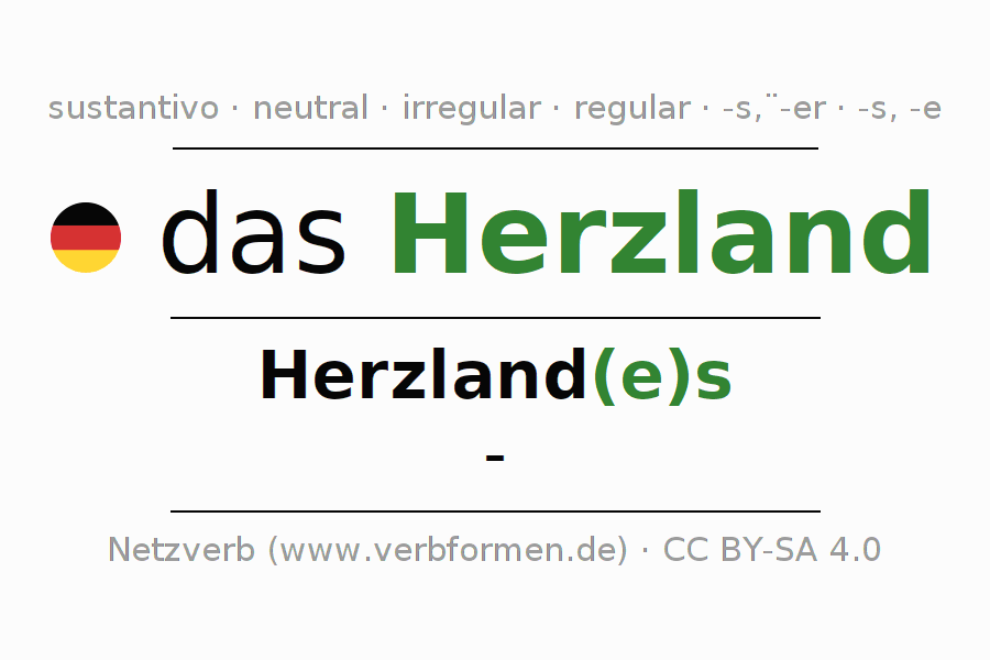 La declinación del sustantivoHerzland (corazón) se encuentra en genitivoHerzland(e)s del singular y en el nominativo- del plural. El sustantivo Herzland se conjuga de forma fuerte (irregular) con estas terminaciones es/-. El plural requiere el uso de diéresis. No permite construcciones en plural. El género gramatical de Herzland es neutro y por eso se requiere el artículo definido ‘das’. Aquí puedes declinar no solamente Herzland sino también todos los sustantivos alemanes . Comentarios ☆