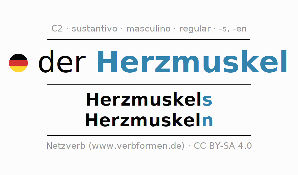 La declinación del sustantivoHerzmuskel (miocardio) se encuentra en genitivoHerzmuskels del singular y en el nominativoHerzmuskeln del plural. El sustantivo Herzmuskel se conjuga de forma mixta con estas terminaciones s/n. El género gramatical de Herzmuskel es masculino y por eso se requiere el artículo definido ‘der’. Aquí puedes declinar no solamente Herzmuskel sino también todos los sustantivos alemanes . Este sustantivo pertenece al vocabulario necesario para pasar el examen "Zertifikat Deutsch" o para el nivel C2. Comentarios ☆