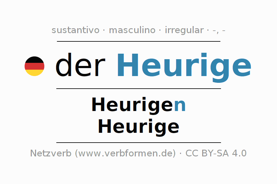 La declinación del sustantivo en forma de tabla con todas su formas: singular, plural y en los cuatro casos: nominativo (primer caso), genitivo (segundo caso), dativo (tercer caso) y acusativo (cuarto caso). Las construcciones gramaticales están representadas de forma clara en una tabla sinópica. La inflexión de los sustantivos es una ayuda durante tareas, exámenes, para cursos de alemán, la universidad, el estudio del alemán como lengua extranjera o como segundo idioma y para estudiantes adultos. La declinación correcta de las palabras es especialmente importante para los que aprenden el idioma alemán. Aquí encontraras más información acerca del tema Wiktionary Heurige y aquí también a través del Duden Heurige.