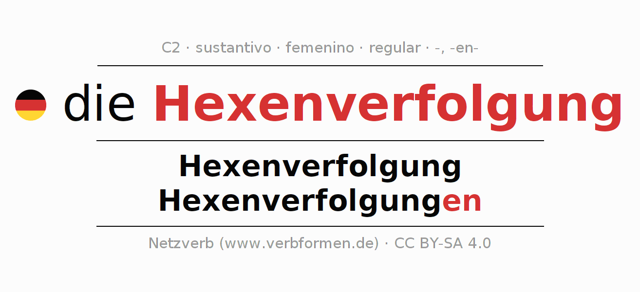La declinación del sustantivo en forma de tabla con todas su formas: singular, plural y en los cuatro casos: nominativo (primer caso), genitivo (segundo caso), dativo (tercer caso) y acusativo (cuarto caso). Las construcciones gramaticales están representadas de forma clara en una tabla sinópica. La inflexión de los sustantivos es una ayuda durante tareas, exámenes, para cursos de alemán, la universidad, el estudio del alemán como lengua extranjera o como segundo idioma y para estudiantes adultos. La declinación correcta de las palabras es especialmente importante para los que aprenden el idioma alemán. Aquí encontraras más información acerca del tema Wiktionary Hexenverfolgung y aquí también a través del Duden Hexenverfolgung.