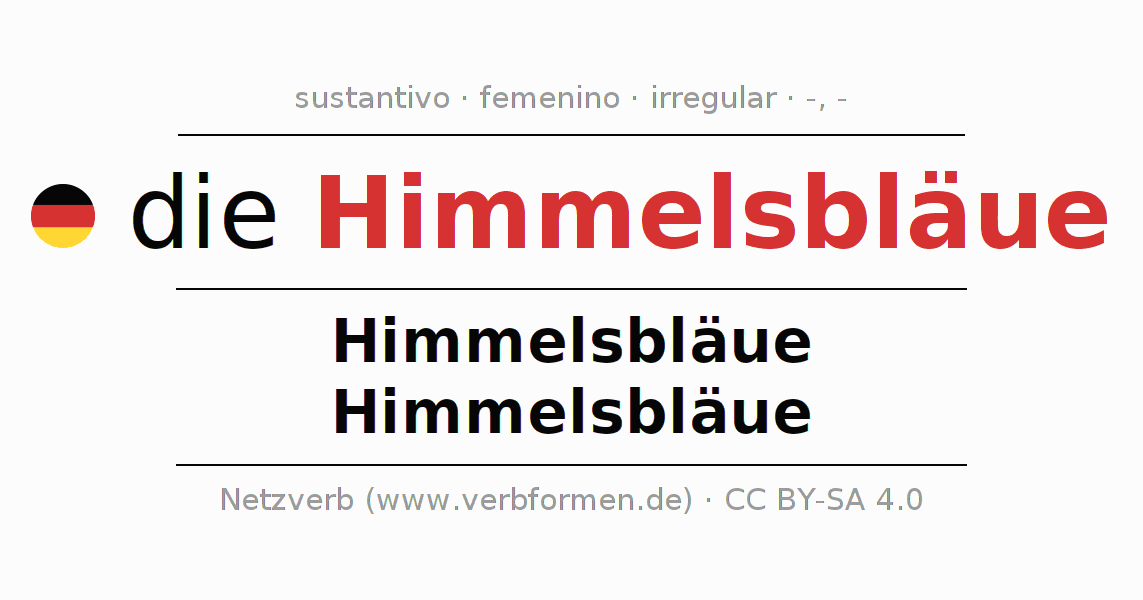 La declinación del sustantivo en forma de tabla con todas su formas: singular, plural y en los cuatro casos: nominativo (primer caso), genitivo (segundo caso), dativo (tercer caso) y acusativo (cuarto caso). Las construcciones gramaticales están representadas de forma clara en una tabla sinópica. La inflexión de los sustantivos es una ayuda durante tareas, exámenes, para cursos de alemán, la universidad, el estudio del alemán como lengua extranjera o como segundo idioma y para estudiantes adultos. La declinación correcta de las palabras es especialmente importante para los que aprenden el idioma alemán. Aquí encontraras más información acerca del tema Wiktionary Himmelsbläue y aquí también a través del Duden Himmelsbläue.